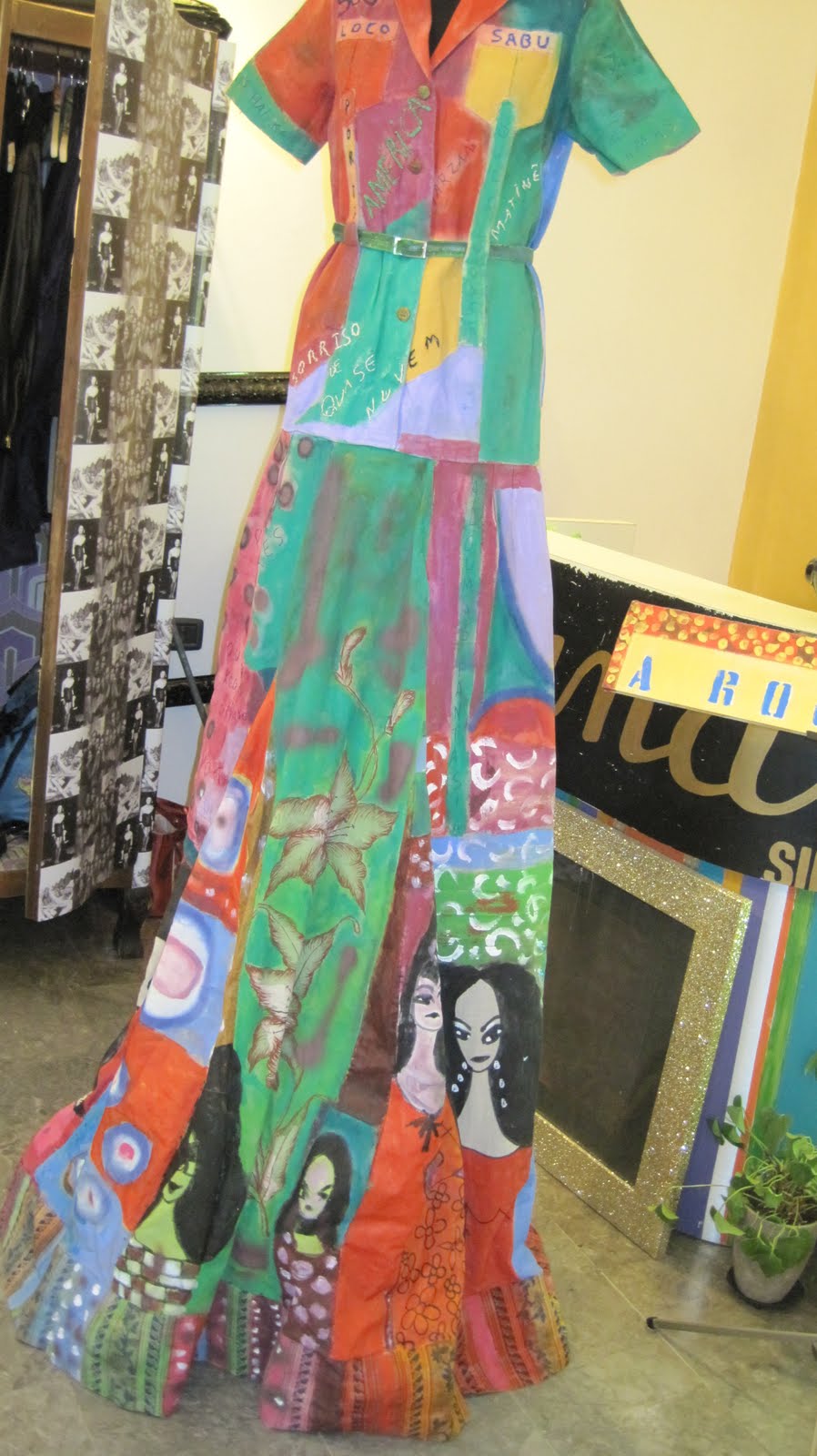 Vestidos objectos em grande dimensão 2.20mts onde se definem estilos de moda diversos que utilizam pintura em acrílica na sua superfície.